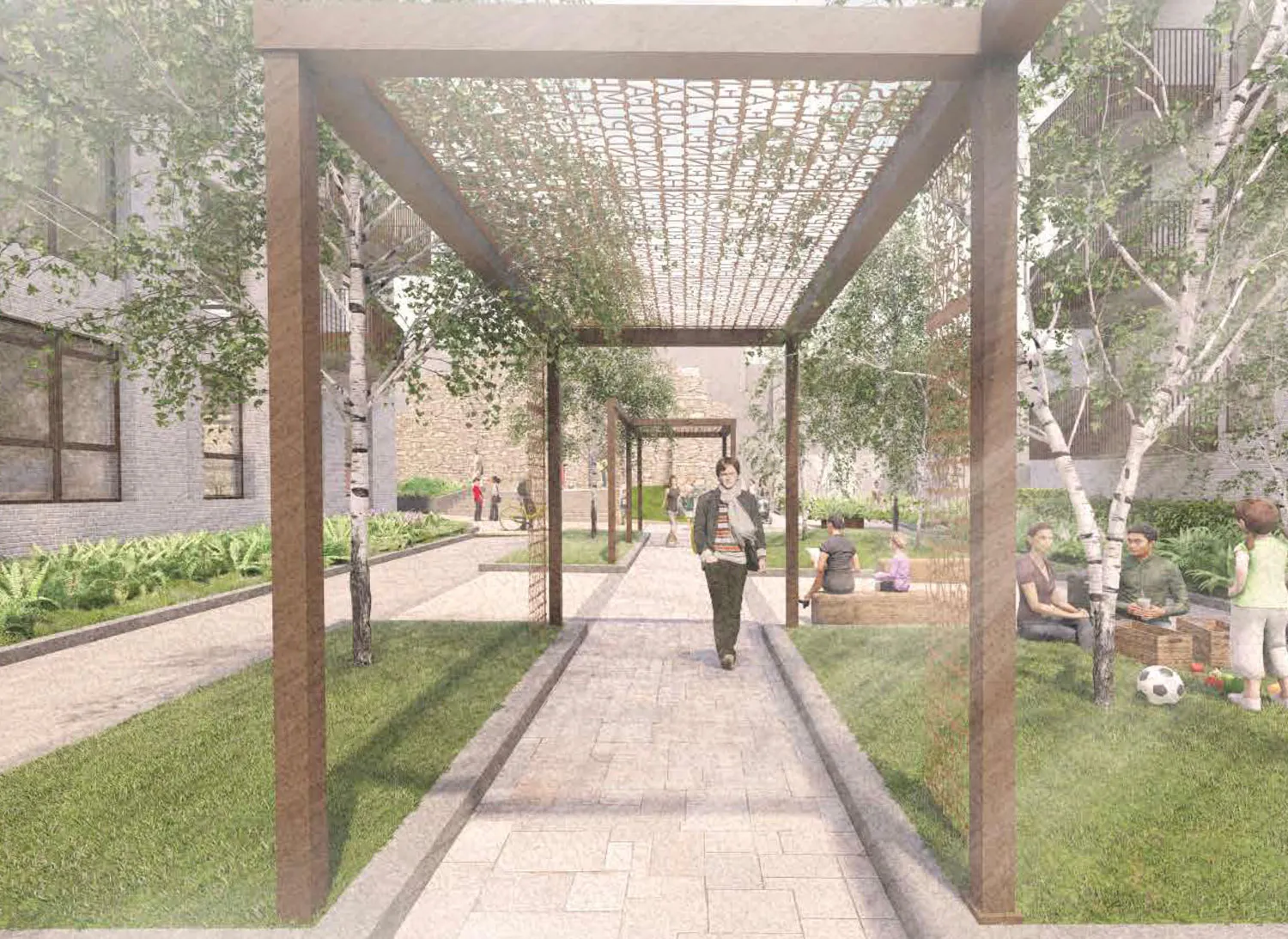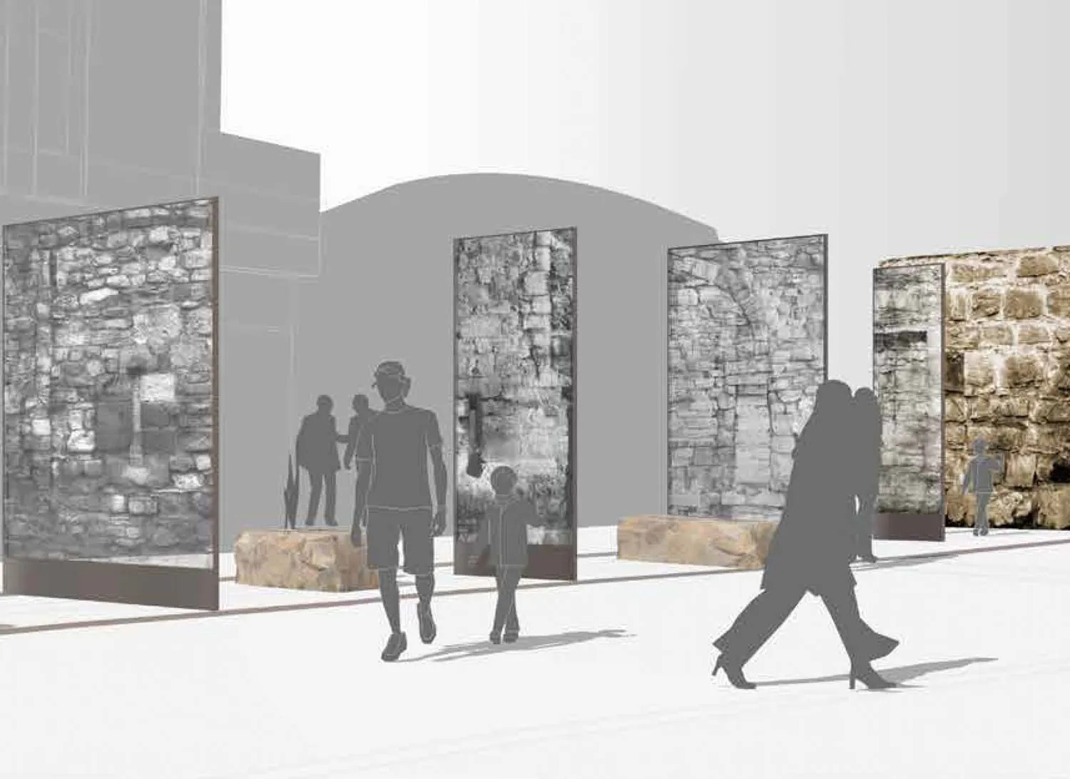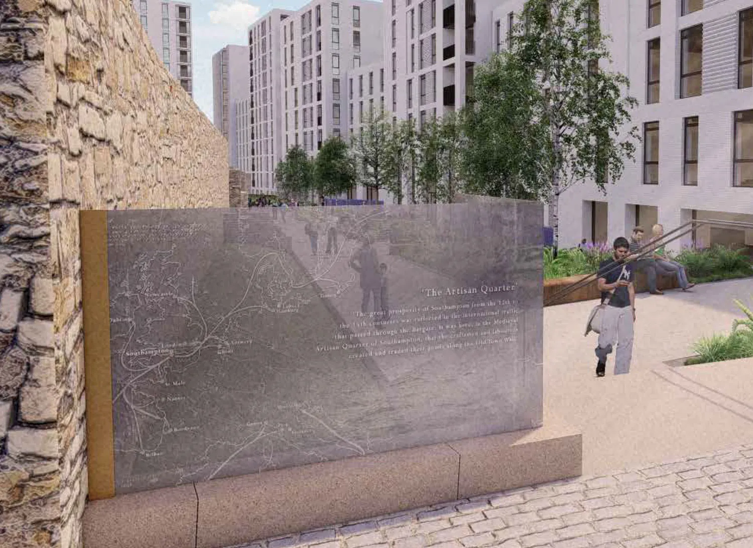 Feature Paving Bands and Roundels honour the medieval artisans, while the Polymond Garden Screen showcases more recent history, including WWII imagery and petitions to save the Bargate. The Artwork Structure – ‘Back of the Walls’ marks the missing eastern wall with a dynamic, ever-changing design.